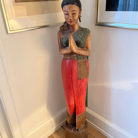 Smuk og dynamisk vintage træskulptur, der forestiller en bøjet menneskefigur i en elegant yoga- eller akrobatstilling. Figuren er håndskåret i ét stykke træ med flotte bløde organiske former og naturlig træstruktur. Undersiden er signeret I Ny. Karsa, som indikerer balinesisk oprindelse og traditionelt håndværk.