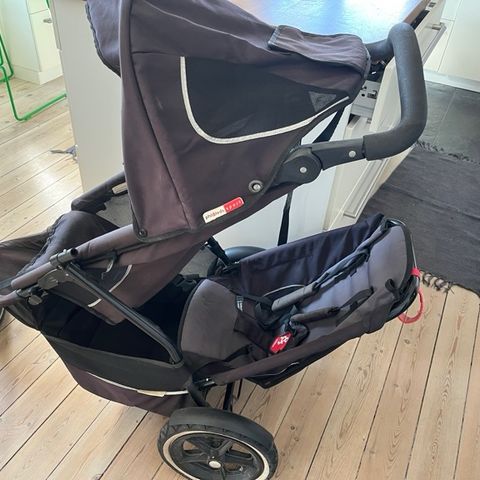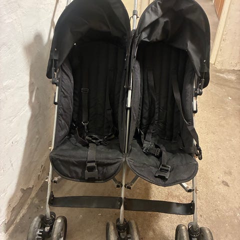 Næsten ny søskende klapvogn (købt i 2023). Det har været den bedste søskendevogn og vi har prøvet lidt forskellige af. Den har skivebremser (yderst praktisk) og der er god plads i den til børnene samt til opbevaring under vognen. Der følger to regnslag med samt et ekstra, der kan sættes på hele vognen. Vognen kan også bruges som løbevogn (forhjul kan låses) og den kan køre i alle slags terræn grundet de store hjul. Hjulene er nye.