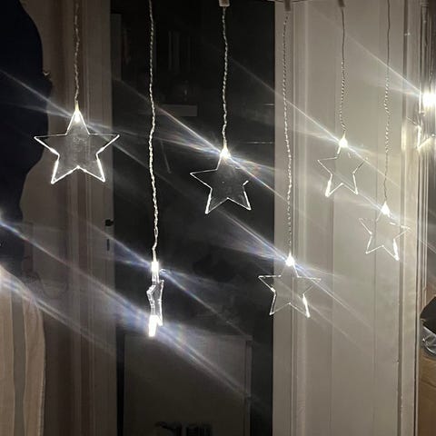 Lyskæde - ophæng, Lyskæde med flere farver lys, foto i mørke er svært at få godt, men på det sidste fotos ses, hvilke farver kæden har. Kædens diameter er 35 cm. Bruger 3 stk. AA batterier. Ledningens længde er 4 m.