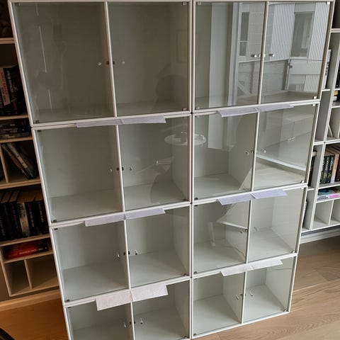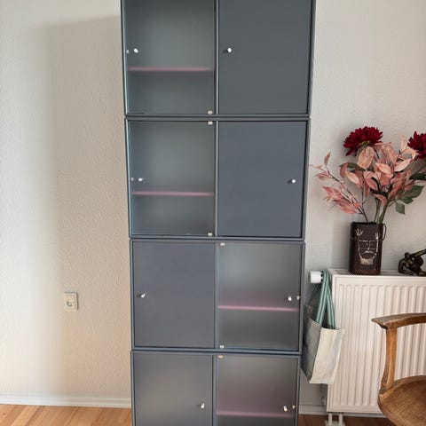 Reol, Montana, To stk Montana glasskabe, model 1118G, i farven 147 Shadow. Hvert modul måler 70x70 og er 38 cm i dybde. Der er monteret ophæng på begge skabe og der medfølger liste til væggen til hvert skab.