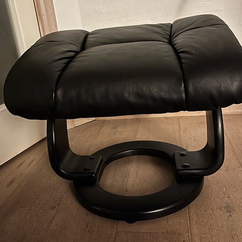 Andre mærker rund skammel i sort læder. Denne skammel har et enkelt og funktionelt design med en rund sædeoverflade og fire ben. Ideel til brug som ekstra siddeplads eller som fodstøtte i stuen eller andre rum.