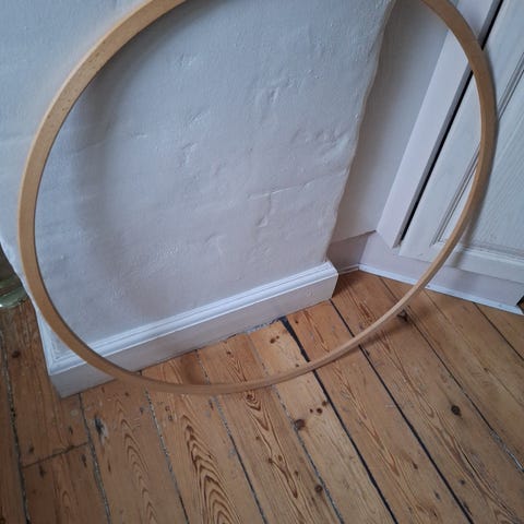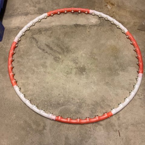 Hoop Hula Hoop i træ og plastik med blå og grå farver. Diameteren fremgår ikke, men den er egnet til træning og leg.