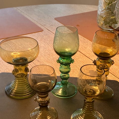 2 skønne Rømer glas med grøn fod og smukke vin ranker