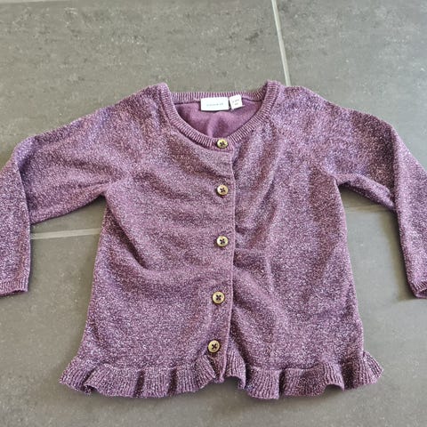 Lilla cardigan med et strejf af glimmer. Knaplukning. Str. 110. Mærke: Name It.