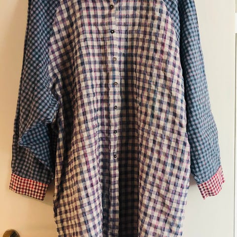 Dejlig blød top med tern i lilla, rosa og hvid. Størrelse L men passes også af en M. Kan strækkes meget. Brystmål 90 cm (uden at strække). Kan strækkes til mindst 114 cm. Længde 54 cm.
