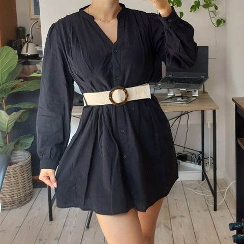 Sort blusekjole fra Fashion Nova med beige farvet taljebælte. Bæltet er i flet, og der er stræk i så den passer til taljen af den som bæer det.