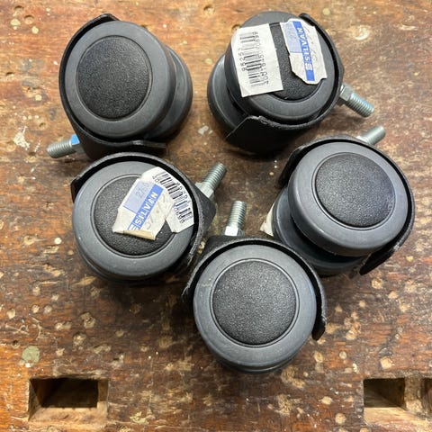 Møbelhjul, 4 stk. med skærm og monteringsplade. NYE, jeg har lige klippet posen op. Bredde 3,4cm. Højde 5,8cm. Diameter hjul 4,8cm. Vejer 280g.