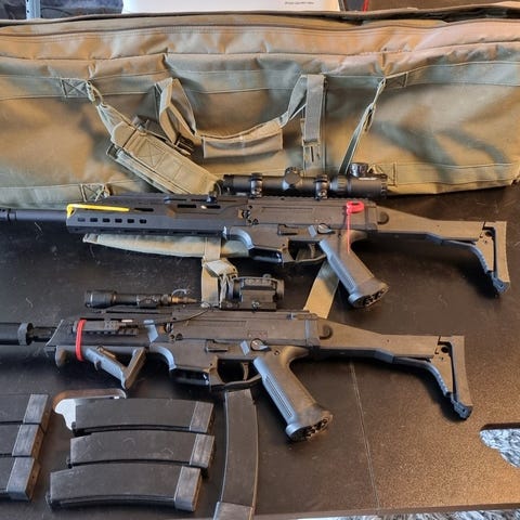 Der lidt af det hele 1 automatiske rifler, en manuel sniper og en manuel pistol en el pistol. 2 gas håndgrandater helt nye kun afprøvet 1-2 gange. Tøj og en masse andet.