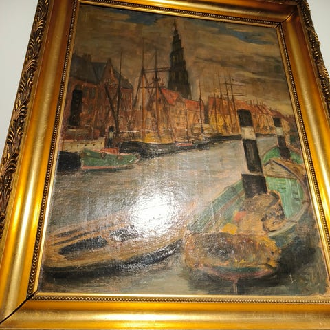 Oliemaleri fra 1940’erne af Robert Panitzsch (1879-1948). Motiv af Vor Frelser Kirke på Christianshavn med det spiralsnoet kirkespir, Sct Annæ Gade og malet fra Ovengade Neden Vandet.