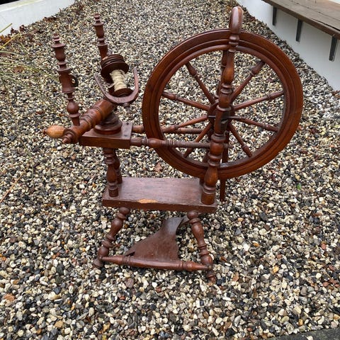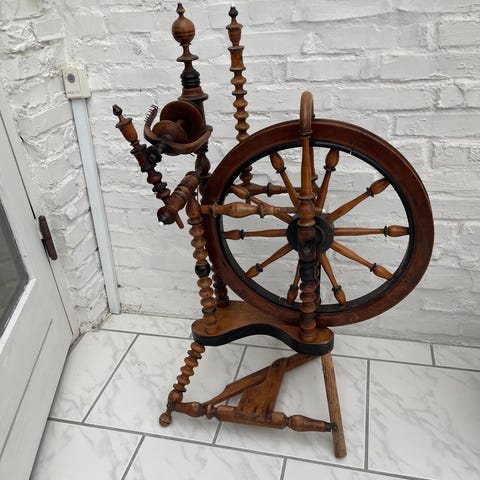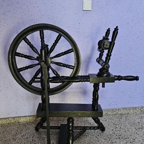 En utrolig flot sortmalet spinderok fra ca. 1850. Virker - lædersnorene er dog blevet løse. Højde ca. 120 cm., dybde ca. 36 cm og bredde ca. 52 cm.