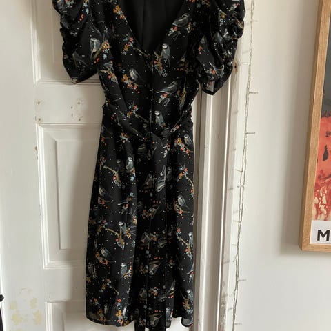 Rigtig sød kjole - eller evt. tunika over bukser - i fint, blomstret Libertyprint i grå, hvid, blågrå og mørk grøn. Bomuld. Fra Flybirdfly i str. M. Da kjolen er vid/oversize kan den bruges af flere størrelser. Kjolen kan lukkes med en lille hægte ved halsudskæringen. Se foto af kjolen åben og lukket. Se nærbillede af det fine stof. Kjolen har to gode lommer og ærmer som går ca. til albuen.