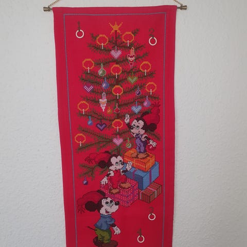 Håndlavet julekalender/pakkekalender tæppe m. Mamuschka motiv, samt æske med 24 små nummereret klemmer.