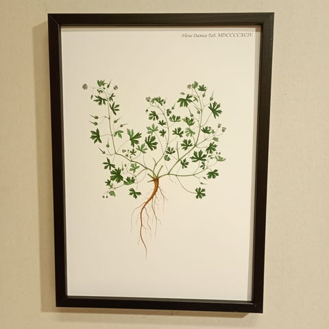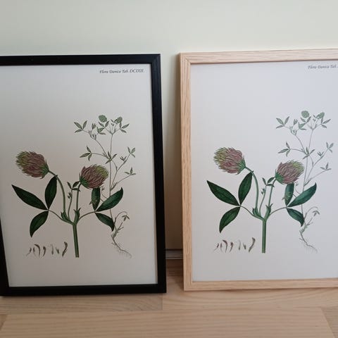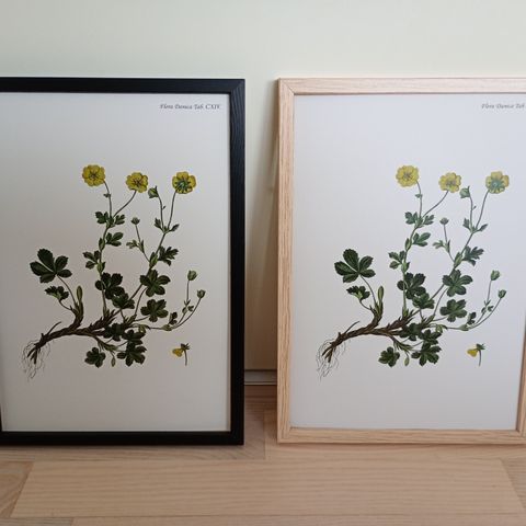 Flotte Flora Danica blomstertryk i træramme fra Hoei. Rammen fåes i enten sort eller egelook. Nye. A4 størrelse. Rammemål 22,7 x 31,2 cm. 129,- pr. stk.