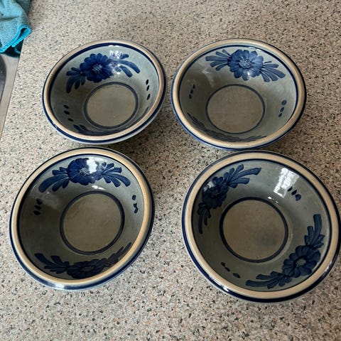 Skåle, Søde femkantede skåle i træ med frugtmotiver. 15 cm i diameter. Aldrig brugt