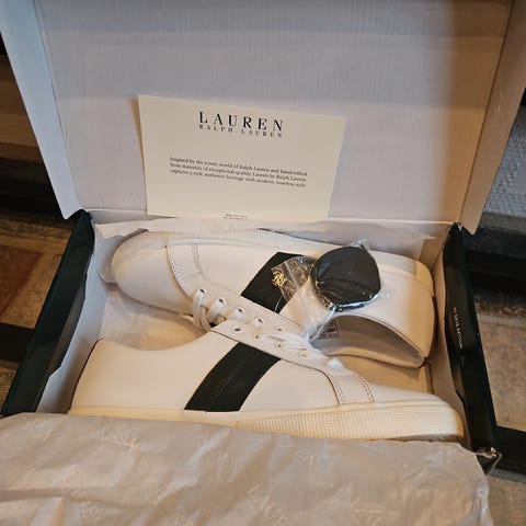 Ubrugte sneakers sko fra Ralph Lauren i hvidt læder med guld detaljer.