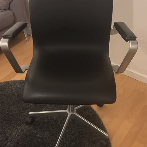 2 stk flotte kontorstole i cognac farvet læder. Red label. Meget pæn stand. Designet af Arne Jacobsen og produceret hos Fritz Hansen.