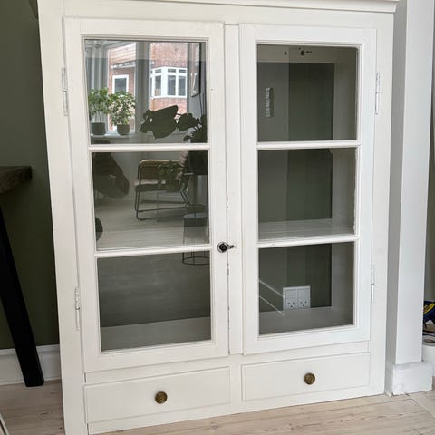 Hvidt vitrine med patina. hænges på væg eller stå virkelig fint skab skal hentes I Ishøj på stue plan . Sælges på grund af flygtninge Hvidt skab.