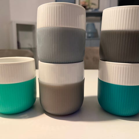 Et krus har et lille hak foroven, som kan ses på billede. og den beige farve på silikonen fremstår ikke 100% ens