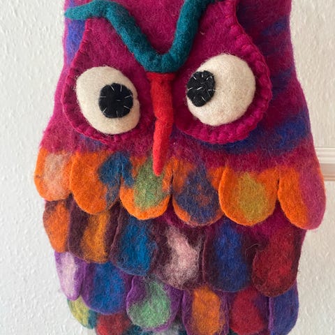 Taske med uglemotiv og franske poststempler i stof og læder