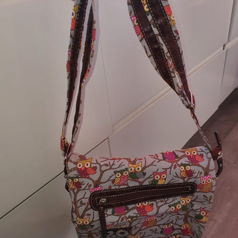 Taske med uglemotiv i farvet læder og en anden taske med franske poststempler i beige stof. Begge tasker har justerbare stropper og indvendige lommer til opbevaring. Materialerne inkluderer læderdetaljer og robust stof. Taskerne er velegnede til daglig brug og kan rumme personlige ejendele.
