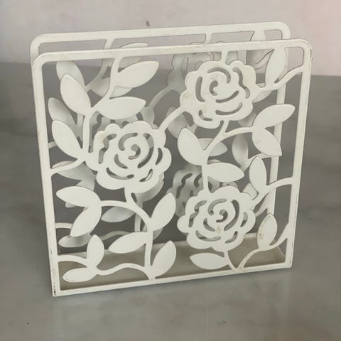 Servietholder i romantisk stil/fashionable. Metal, råhvid. Mål 18x18 cm passer til frokostserviet (16x16cm). Vældig fin til indendørs og udendørs brug.