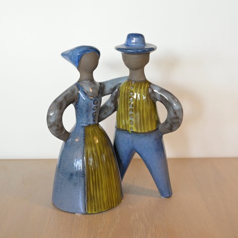 mand - kvinde rakubrændt skulpturer i form af to figurer som kan placeres i hver sin stol. Et armlæn med defekt og andre små defekter. Signeret I. Wei.