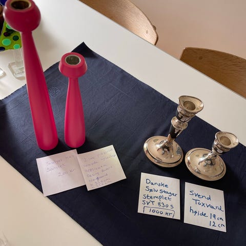 Sølvlysestager, Sølv, sølvstager: 7 lysestager hvoraf mindst de 3 store er af Svend Toksværd.
