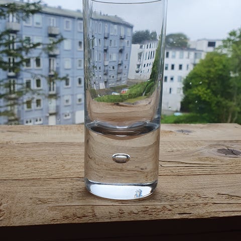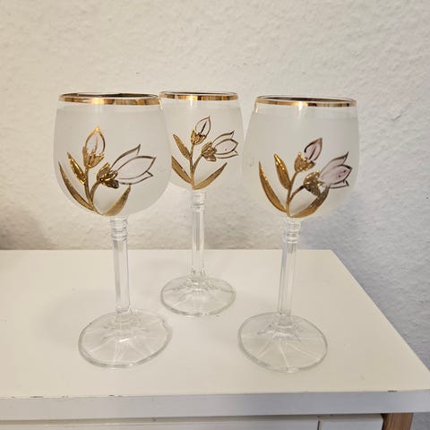 Glas med blå fod og guldpynt, købt i 80'erne fra den polske Krosno fabrik, 4 stk. høje vinglas samt 4 stk. ølglas, mundblæste, ikke brugt ret meget.