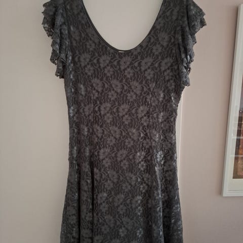 Rigtig flot festkjole eller sommerkjole. Søde blonde ærmer. Indsnit som giver en slank figur. Metalblå. Helt fin og ubrugt. Prisen er fast. Se div. foto. KAN OGSÅ SENDES.