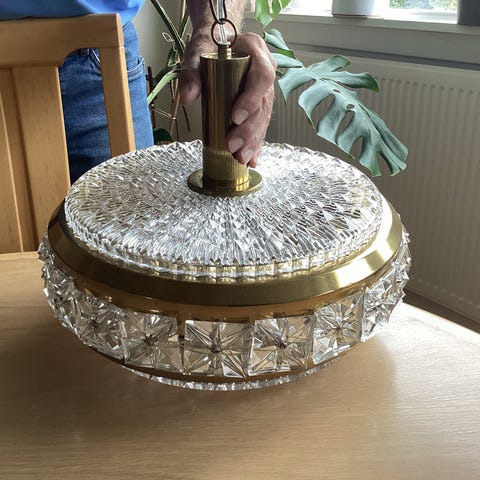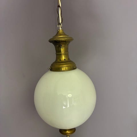 Har denne loftslampe i messing og glas.