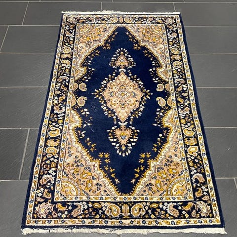 Håndknyttet Kirman tæppe med motiv af vase med blomster. Ren silke på bomuldsbund, meget tæt knyttet. Også velegnet som vægtæppe.