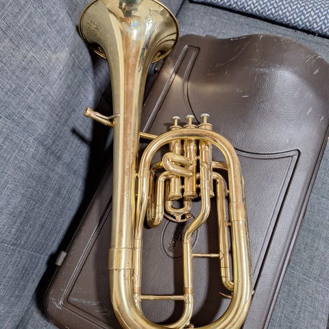 Som ny , fra Juni 2024 . Alle rør og ventiler kører let. Spiller med dejlig tone. Mundstykke Besson 5b medfølger.