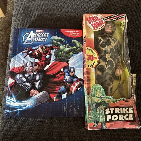 Kasse med en lille bog og 10 figurer fra Avengers universet.