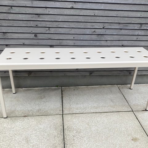 Har to sæt. Ronan og Erwan Bouroullec for HAY. To havebænke samt havebord med stel af pulverlakeret metal i farven Desert Green. Bænke: H. 46 cm. L. 165,5 cm. D. 35 cm. Bord: 190x87cm. H: 74cm. Fremstillet hos HAY, model Balcony. Nyudpakket og nysamlet. Tunge og stabile havemøbler.