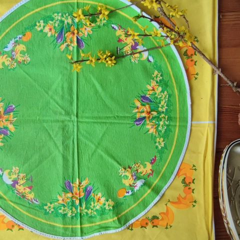 Med kyllinger og pÄskeliljer. Flotte klare farver og fin stand. Lidt smal sÄ brug den evt som bordlÞber over en anden dug. 84*134 cm. Du kan loppesjoppe den for 115 kr.