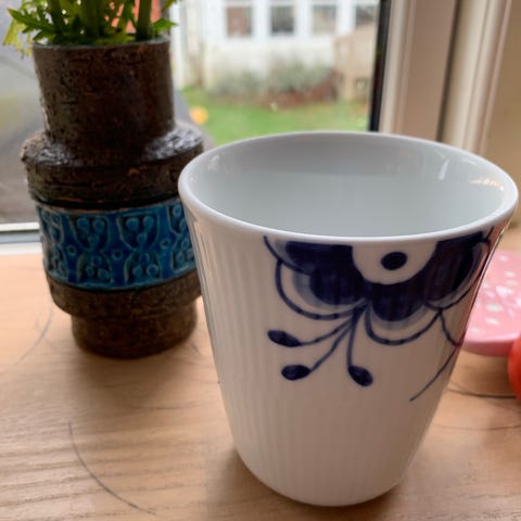 Fin royal Copenhagen blå mega kop. 1. Sortering. Har et lille skår i kanten. Sender ikke denne.