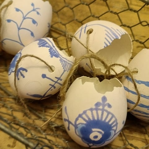 Påskeæg lavet af rigtige, danske hønseæg, der er pustede, vaskede, tegnede og lakerede. Til sidst er der monteret snor i det ene pustehul.