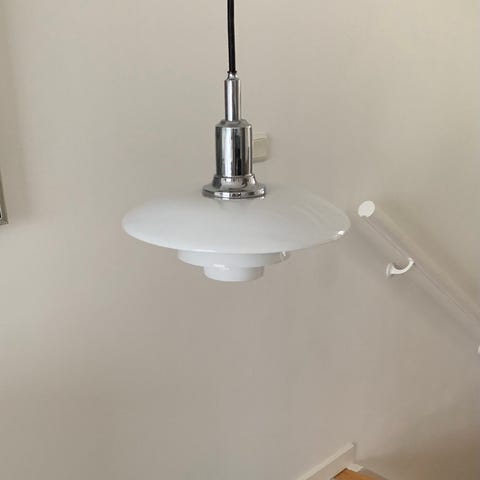 Sælger denne smukke PH 3/2 pendel, som giver et behageligt, blændfrit lys – perfekt over spisebord, køkkenø eller i entreen. Klassisk design med sort top og opalhvidt glas. Måler 28,5 cm i diameter og 24,2 cm i højde.