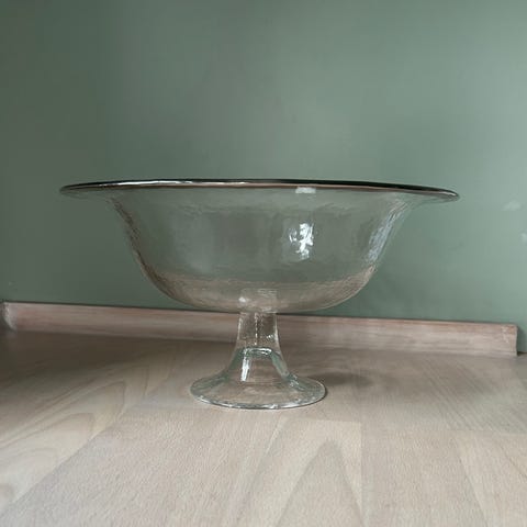 Mange anvendelsesmuligheder, fx frugtskål eller dekoration. Fod og skål er i pletsølv. Indsatsen er i den smukkeste facetslebne glas.
