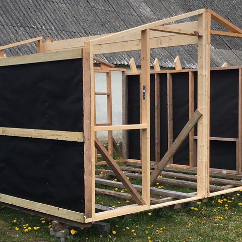 Tømmer konstruktion, 30 m2 havehus / udhus / anneks konstruktion. Restsalg skelet rammer, gulvbjælker og spær. Delvis af genbrugstræ,