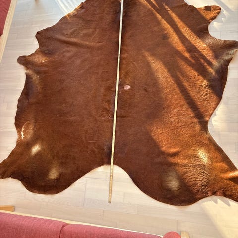 Næsten nyt skind. Har ikke været brugt på gulv. Mærkerne på skindet er autentiske brændemærker på koen (numre, han-hunkønstegn, osv).