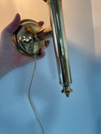 Denne ældre væglampe har et smukt messinglook og en flot intakt røgfarvet glas skærm.