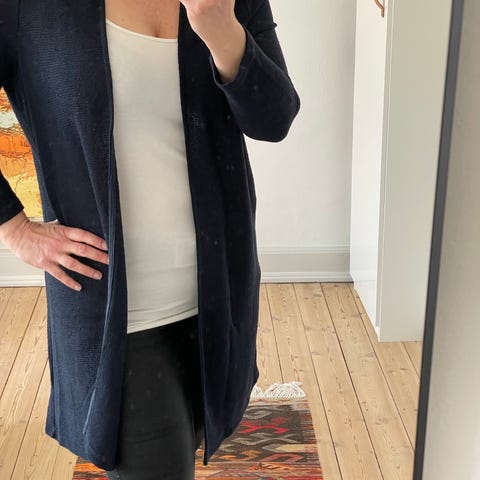 Lækker, blød og lang hvid og lysebrun stribet åben cardigan fra Kartu i Kbh. Str s i rigtig god stand.