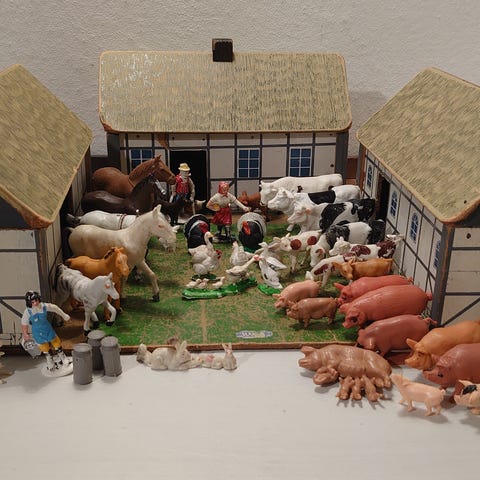 Gammel bondegård i træ med aftagelige tage bestående af stuehus, lade og 12 trædyr på fod.