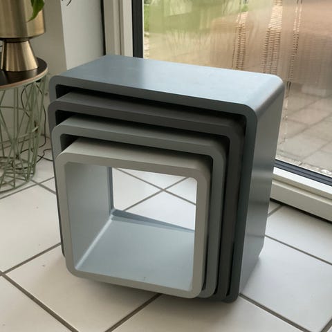 Ovale bogkasser fra Sebra. Bogkasserne kan stilles op som reol eller monteres på væggen. Sættet består af fire bogkasser.