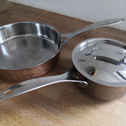 Køkken , kobber stegepande 25 cm og kasserolle 14 cm - made in Portugal - har noget slid- kan sendes