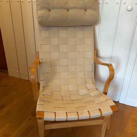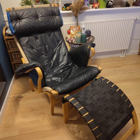 Sælger denne dejlige lænestol designet af Bruno Mathsson. Stolen hedder Pernilla med tilføjelsen Dux, som er en mere luksuriøs udgave af modellen. Kendt for sin komfort og klassiske udseende i formpresset bøgetræ.