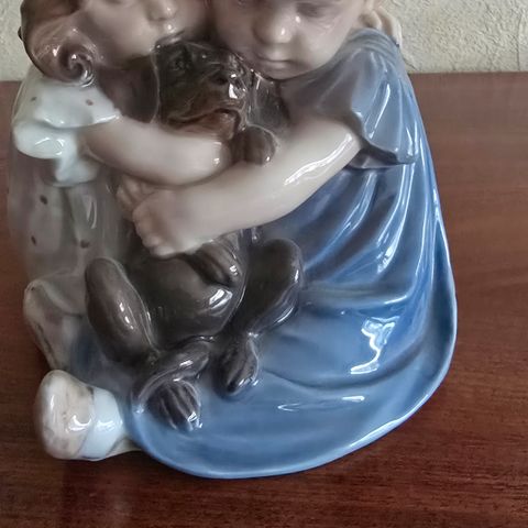 Flot porcelænsfigur fra Royal Copenhagen - 2 børn siddende med hundehvalp.