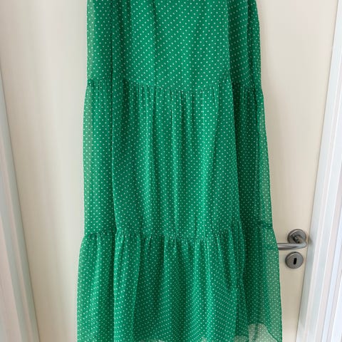 Mørkegrøn blank nederdel. InTown str. 42. L 97cm. Med smart effekt: folder syet forneden, så nederdelen folder indad. 50% polyester, 50% polyamid.