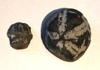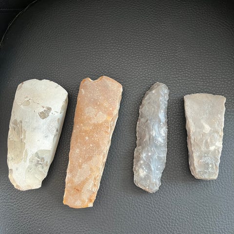 Lille samling div. flinteredskaber bestående af øksehoved (knækket, men æggen er flot), spydspids, pilespidser samt vættelys og forstenede søpindsvin.